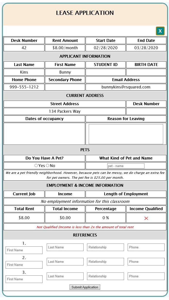 Students apply for rental property (their desk) online through our rental process. They can choose a seat based on price, description, location, or any number of factors. Teachers have the flexibility to customize this process as much or as little as they desire based on their specific needs.