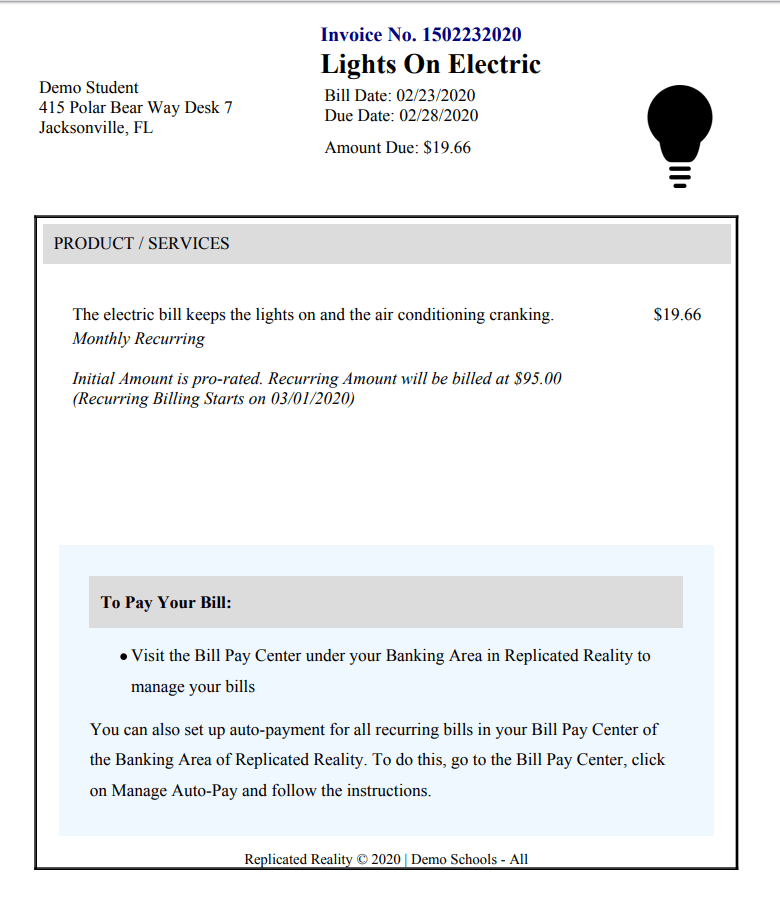 Teachers have the ability to create custom bills – both one-time and recurring bills. This can include unique company names and even company logos. When a bill is assigned to a student, the system automatically creates an invoice for the student to manage and pay in their own bill pay center. This model provides the flexibility to work with any curriculum or program used in the classroom, and provides opportunity to dive into the needs vs. wants financial decision making.